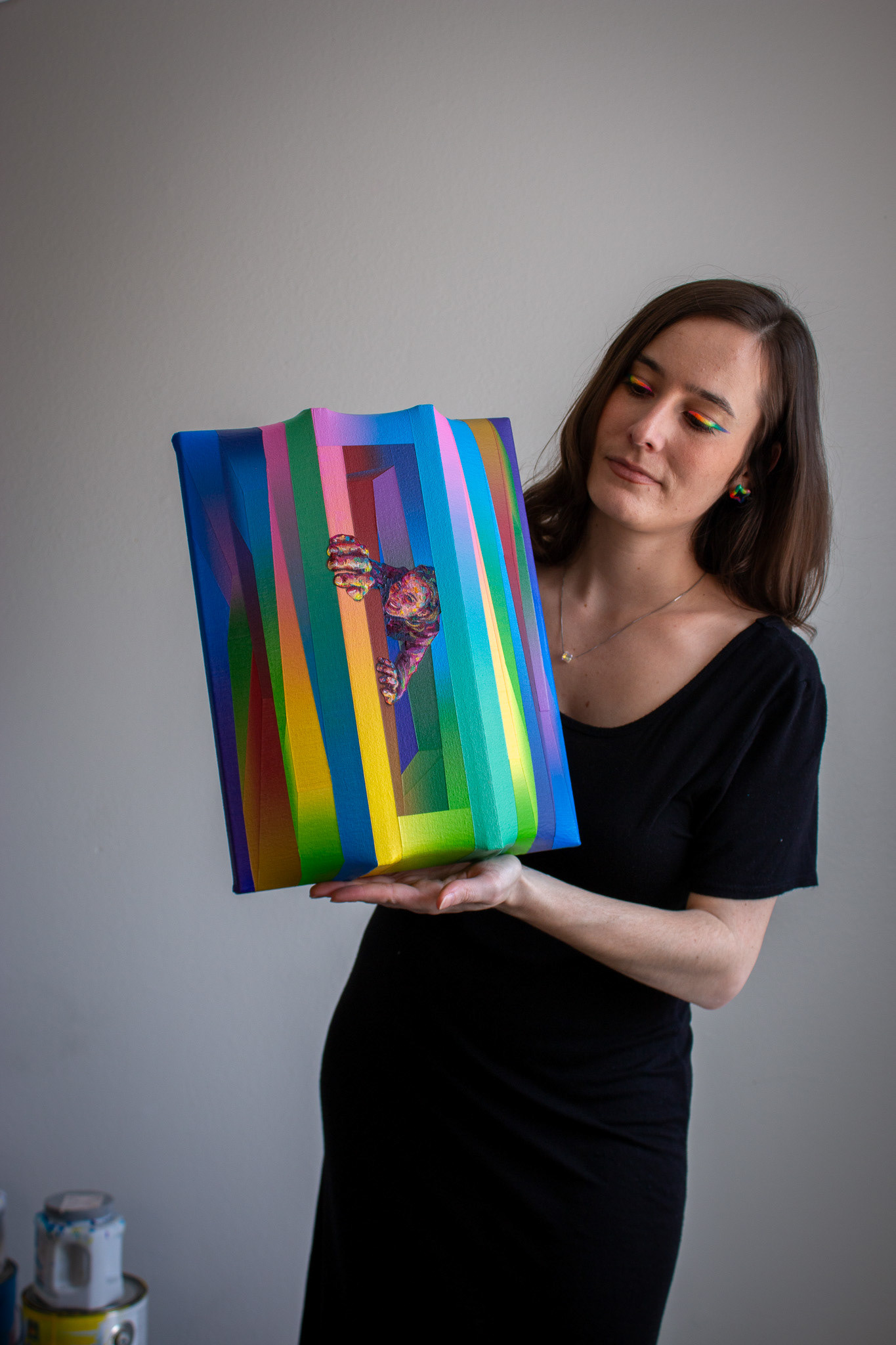 The Shapiens series combines vivid geometry and raw brushwork to represent the extreme highs and lows in life.